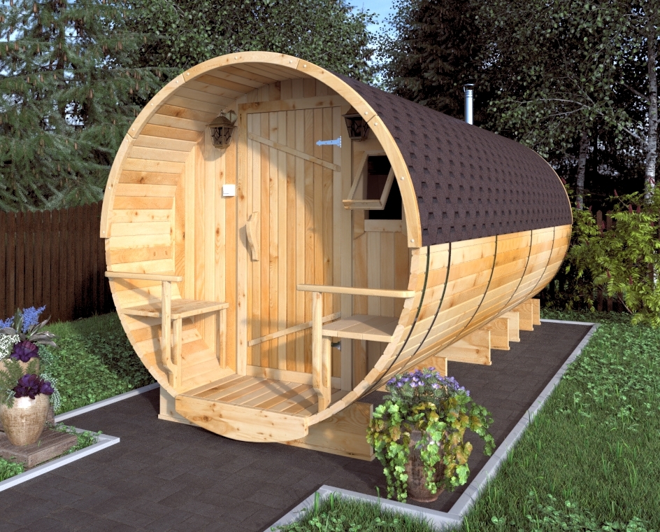 Баня-бочка круглая из кедра с верандой (все размеры) Это изделие круглой вытянутой формы. На веранде можно оставить вещи или отдохнуть после процедур парения. Лавочки из кедра находятся по всей длине бани-бочки с обеих сторон. Печь расположена в парилке около дальней стены. Время растопки такой печи не превышает 30 минут. В зависимости от выбранного размера круглая баня-бочка с козырьком имеет следующую комплектацию: Круглая баня-бочка 2,5 метра - парилка; Круглая баня-бочка 3,5 и 4,5 метра - раздевалка, парилка; Круглая баня-бочка 5,5 метров - раздевалка, парилка, моечная. По вашему желанию ее можно укомплектовать печью с внешней загрузкой, благодаря которой весь мусор вовремя топки остается на улице. Круглая баня-бочка не требует полноценный фундамент, поэтому при необходимости ее можно перенести в другое место. Обращаем Ваше внимание, что в стандартную комплектацию бани входят лавки в парной с обеих сторон. Дополнительно можно заказать полок открытого или закрытого типа! Кедр обладает ароматическими свойствами. Он не деформируется и влагоустойчив, при правильном уходе за деревом на нем не развиваются грибки и плесень.
