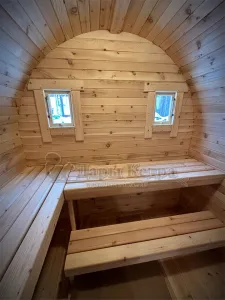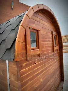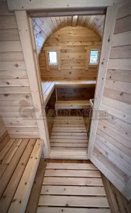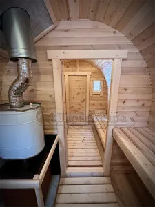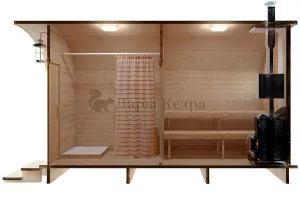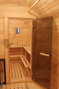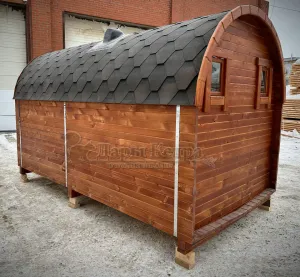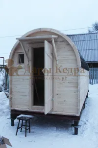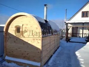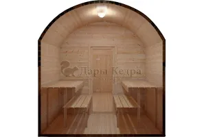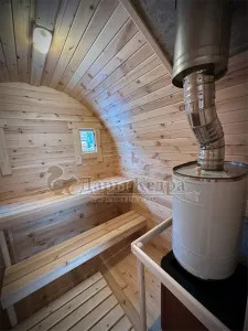 Это более просторная модель за счет увеличенной высоты потолков и ровного пола. В такой модели раздевалка совмещена с моечной. Тут установлен душевой поддон, вешалка, полочка и лавочка из кедра. В парильном отделении по обе стороны расположены двухуровневые открытые полки, печь находится между ними у дальней стены. Время растопки такой бани не превышает 30 минут. По вашему желанию баню-бочку можно укомплектовать козырьком, верандой и печью с внешней загрузкой, благодаря которой весь мусор во время топки остается на улице. Баня-бочка буханка не требует полноценный фундамент, поэтому при необходимости ее можно перенести в другое место.