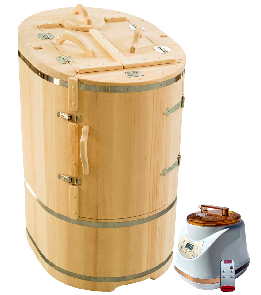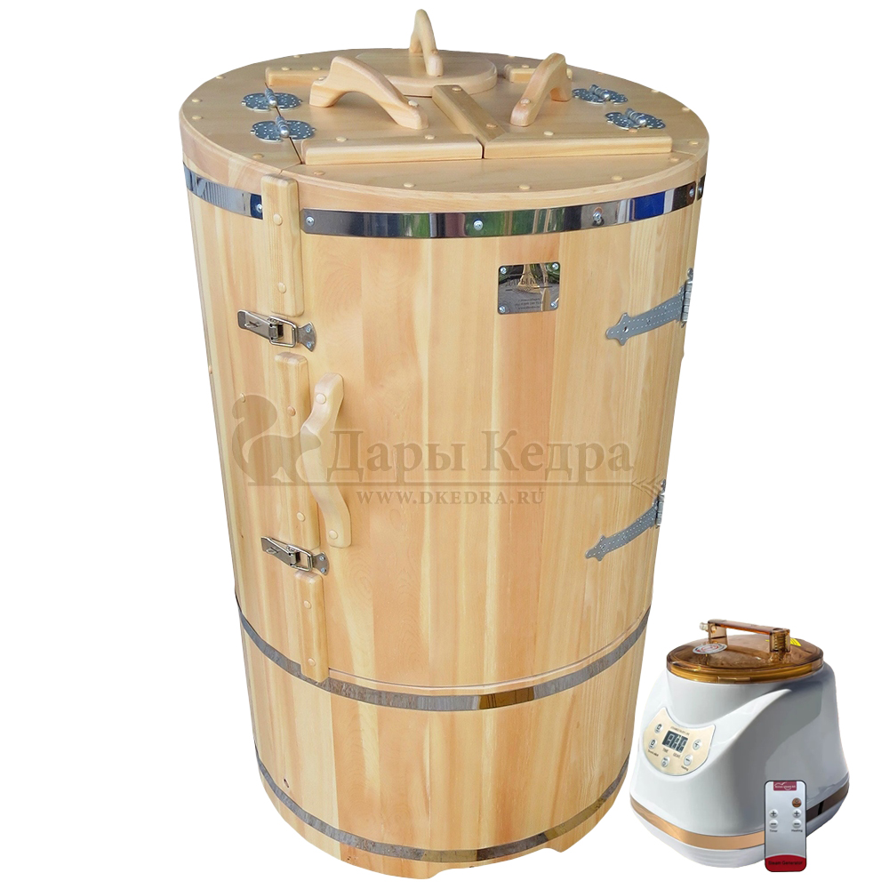 Готовый комплект «Удобный+»: кедровая бочка с парогенератором + био-защита изнутри и снаружи Готовый комплект - это полностью укомплектованный набор с фитобочкой для процедур парения. Овальная модель более просторна и удобна в использовании. Толщина стенок составляет 25 мм. Бочка оборудована откидными створками, дверцей и отверстием для головы. Верхний скос изделия делает положение головы более комфортным и улучшает обзор. Во время парения человек сидит внутри кедровой бочки, а голова находится снаружи. Благодаря этому исключается возможность перегрева. Подлокотники из кедра, встроенные ручки на створках и двери делают эксплуатацию более удобной. Парение в фитобочке благотворно влияет на организм в целом: повышается иммунитет, выводятся шлаки и токсины, улучшается работа органов тела и состояние кожи.