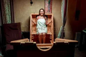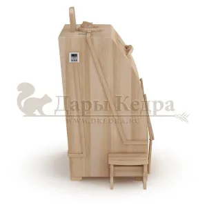 Квадратная двухрежимная фитобочка из кедра может быть использована как инфракрасная сауна и парная. Карбоновые излучатели отвечают за сухое парение, они находятся на внутренней стороне дверцы и задней стенке фитобочки. Влажное парение происходит за счет поступления горячего пара в фитобочку через паропровод. Толщина стенок составляет 40-45 мм, что позволяет увеличить срок службы изделия. Откидная дверь бочки во время открывания фиксируется внешней подставкой - опорой, которая в закрытом состоянии складывается и не занимает лишнее пространство. Во время парения человек сидит внутри кедровой бочки, а голова находится снаружи. Благодаря этому исключается возможность перегрева. Встроенная ручка на двери делают эксплуатацию фитобочки более удобной.