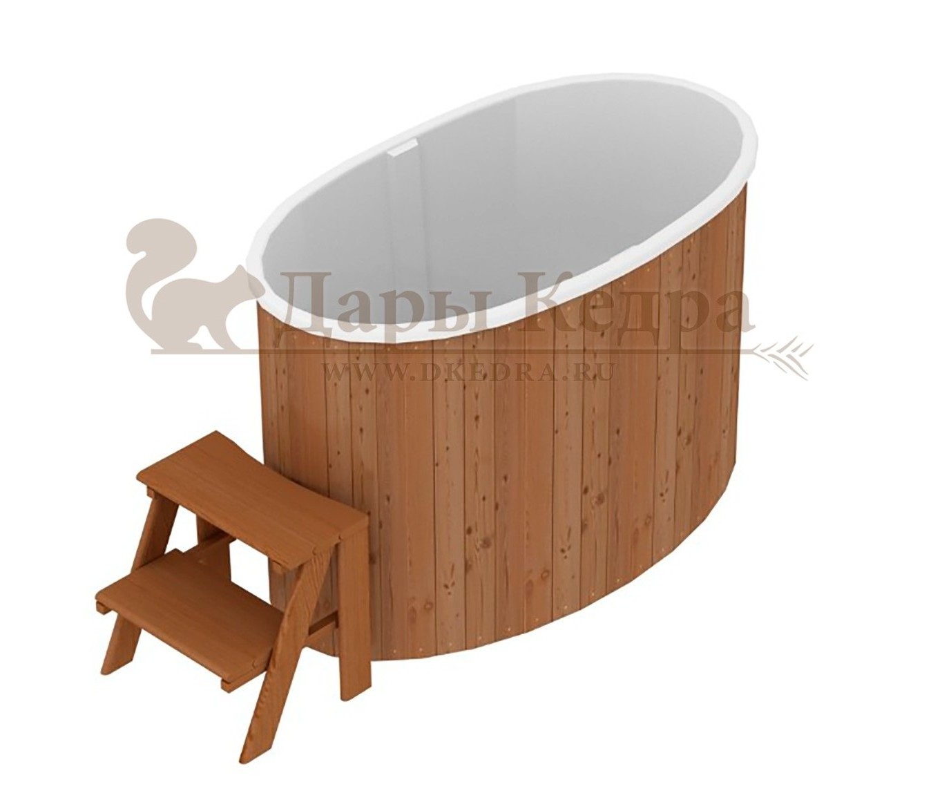 Это купель с внутренней овальной чашей, которая изготовлена из современного прочного и термоустойчивого материала (композита). Форма чаши обеспечивает комфортную посадку внутри изделия. Для удобного использования купель оснащена приставной лестницей. Обручи из нержавеющей стали декорируют купель с композитом и равномерно распределяют нагрузку во время процедур.