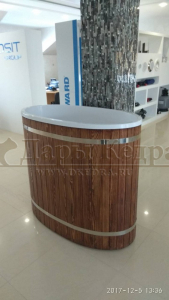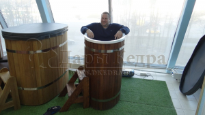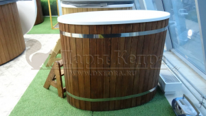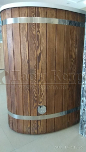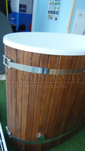 Это купель с внутренней овальной чашей, которая изготовлена из современного прочного и термоустойчивого материала (композита). Форма чаши обеспечивает комфортную посадку внутри изделия. Для удобного использования купель оснащена приставной лестницей. Обручи из нержавеющей стали декорируют купель с композитом и равномерно распределяют нагрузку во время процедур.